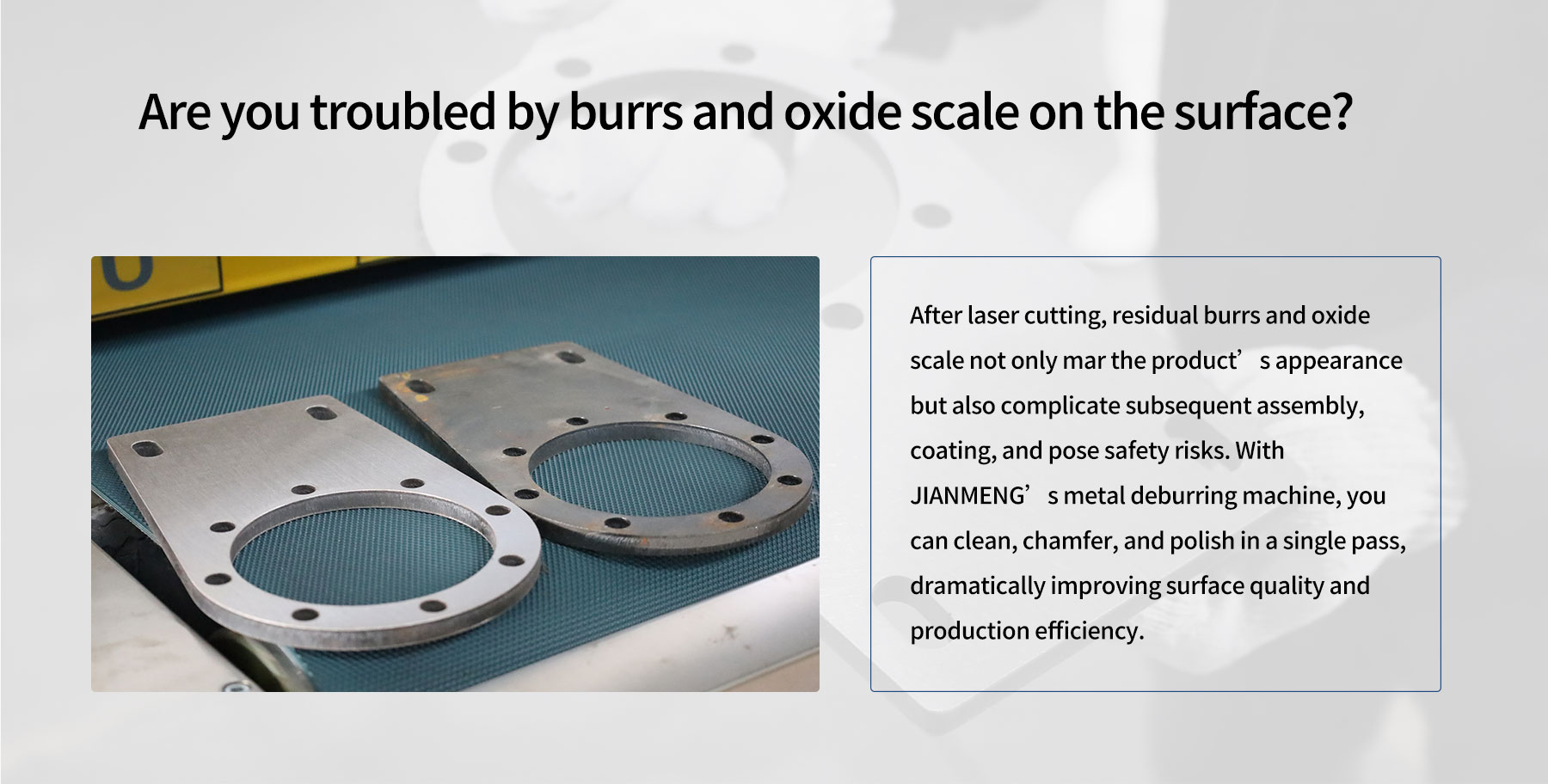 Jianmeng adalah pengeluar terkemuka yang mengkhususkan diri dalam mesin deburring logam. Mesin Deburring Metal adalah peranti perindustrian yang direka khusus untuk mengeluarkan burrs, tepi tajam, dan lapisan oksida dari bahagian keluli logam, plat logam, dan kerjaieces. Mesin deburring logam digunakan secara meluas dalam bahagian-bahagian laser, bahagian keluli ringan, penamat keluli tahan karat, penamat panel lif, penggilap logam hiasan, industri aeroangkasa, pemprosesan logam, pembuatan jentera, komponen automotif, struktur keluli, pembinaan kapal, dan kabinet elektrik.